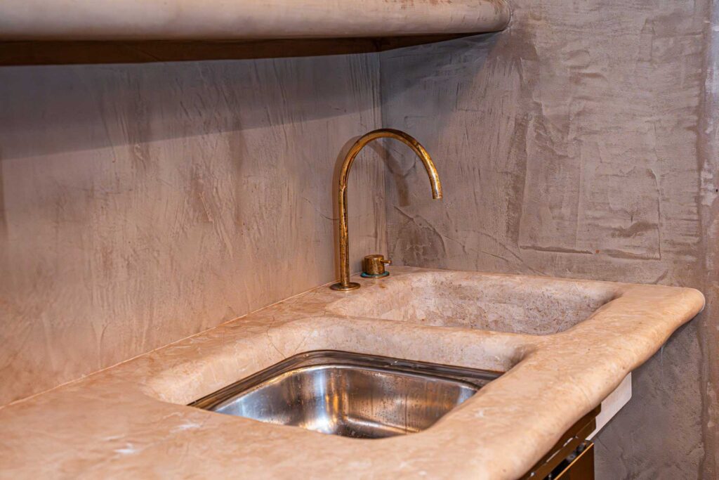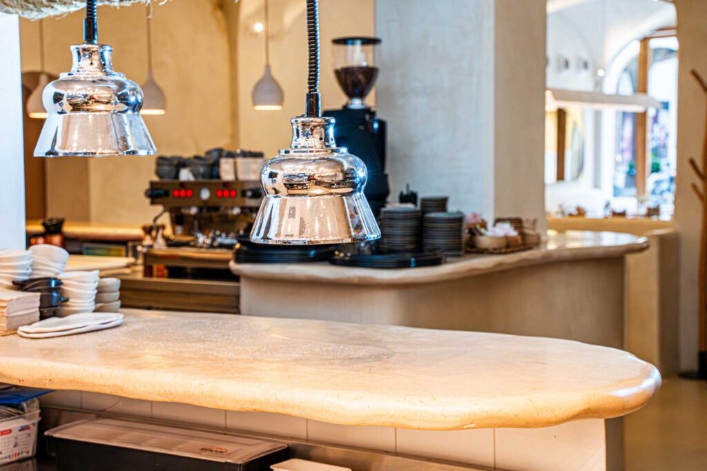 The stone has been used for countertops and sinks, which were custom-made and handcrafted in the workshop by specialised personnel. Each piece has unique characteristics with rounded shapes and a combination of finishes that radiate tranquillity to achieve the restaurant’s natural atmosphere with chromatic balance. The result is a personalised, durable and functional space in line with the project’s requirements.