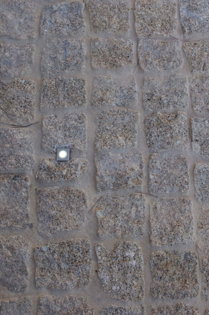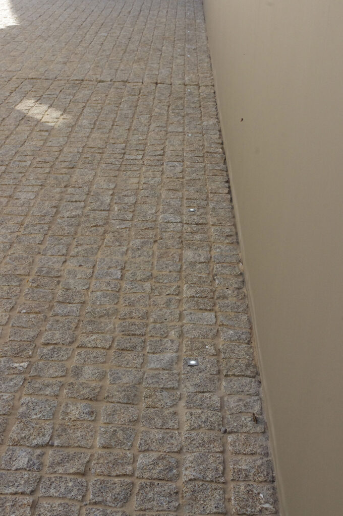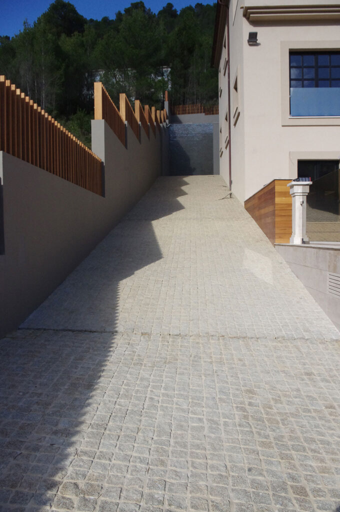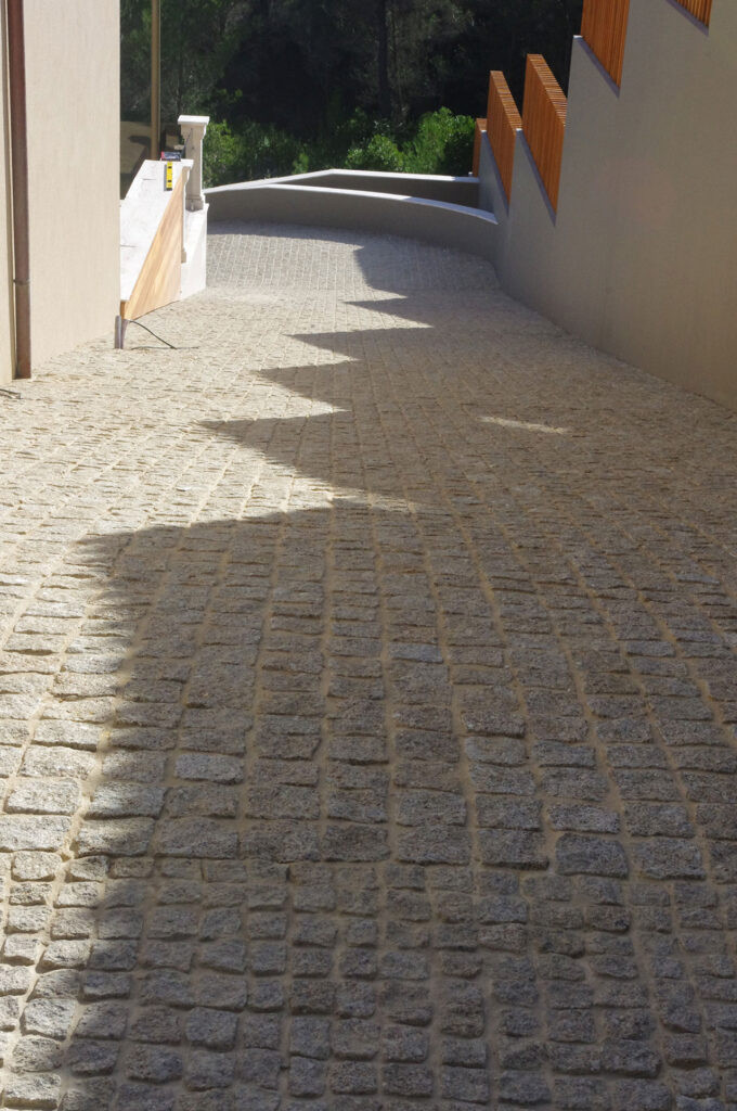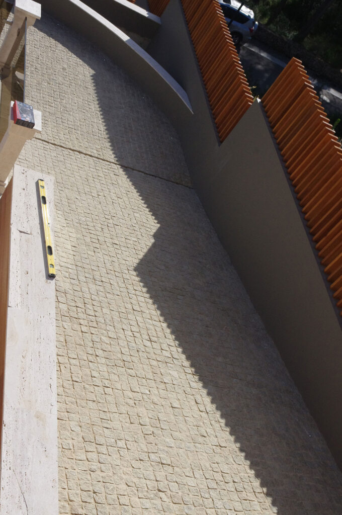 High-quality yellow granite cobblestones in irregular shapes were supplied and laid on this sloping ramp. The laying was carried out by specialised technicians with extensive experience, ensuring the correct levelling, alignment and stability of the paving.